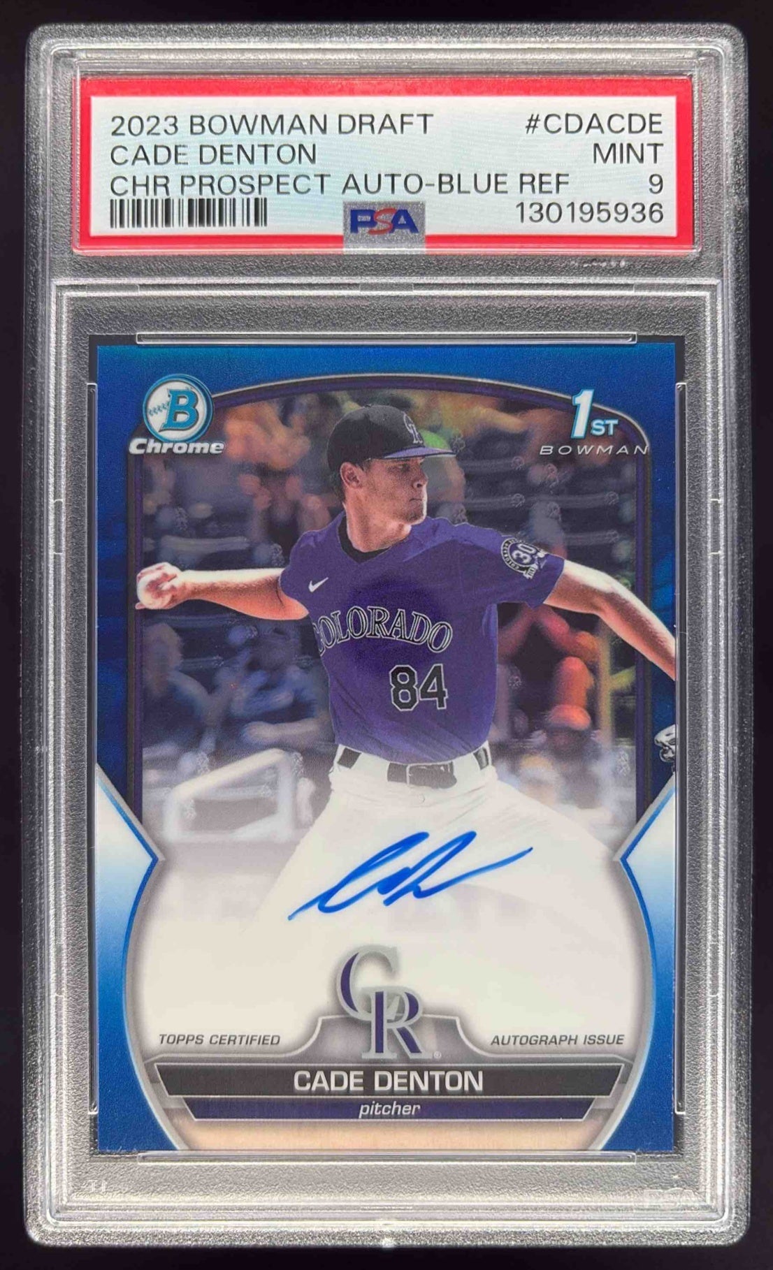 2023 Bowman Draft Chrome Blue Refractor #CDA-CDE Cade Denton RC Auto /150 PSA 9