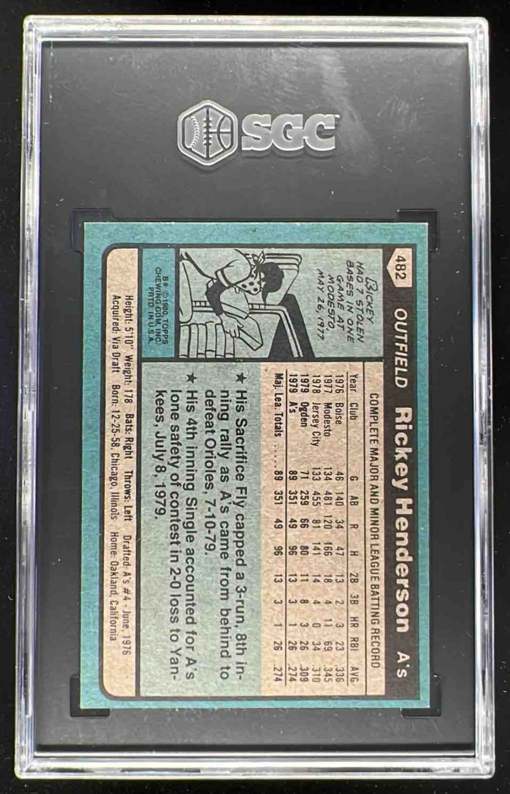 1980 Topps #482 Rickey Henderson RC SGC 8
