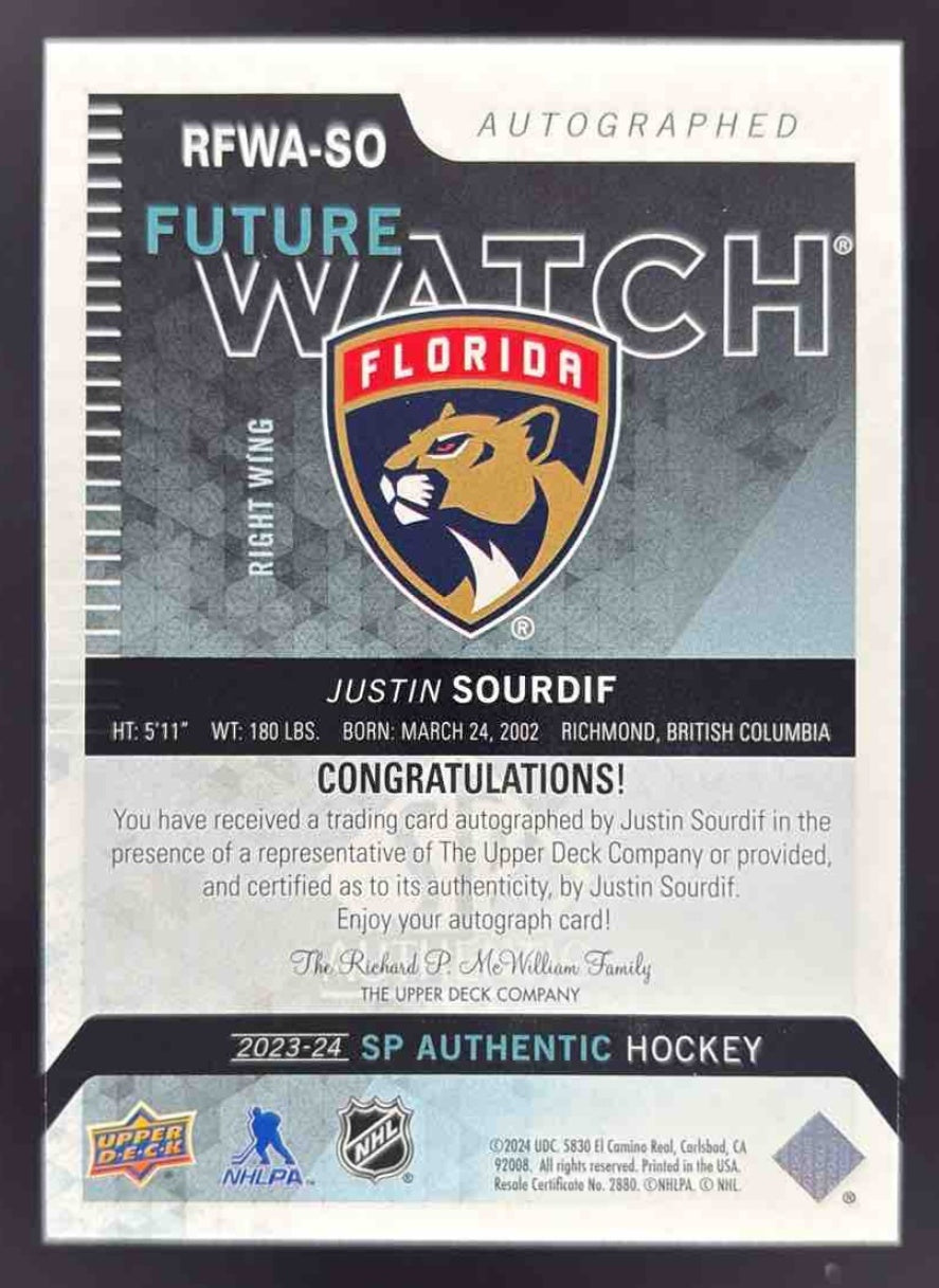 2024-25 Upper Deck SP Authentic Retro Future Watch #SO Justin Sourdif Auto /699