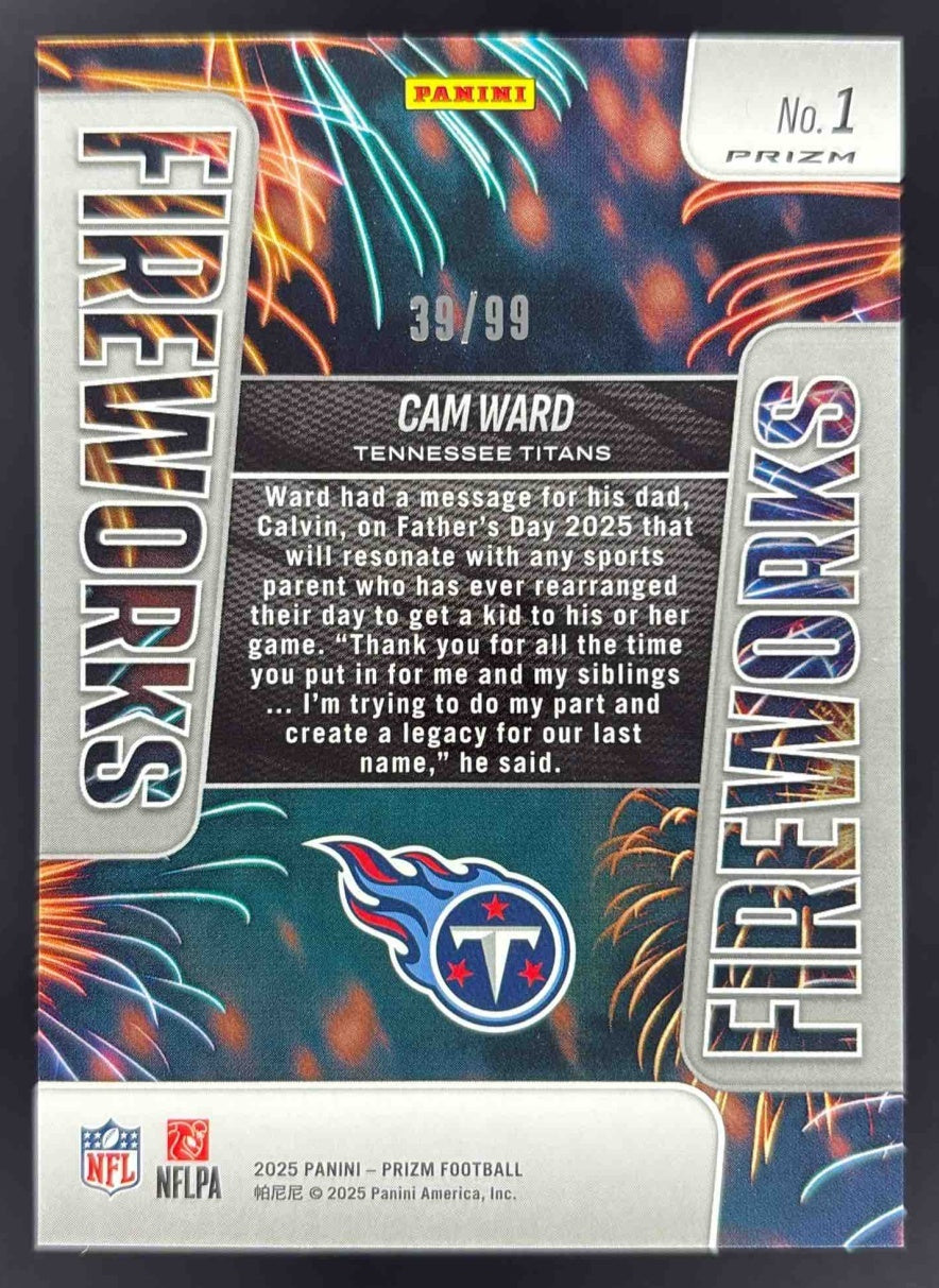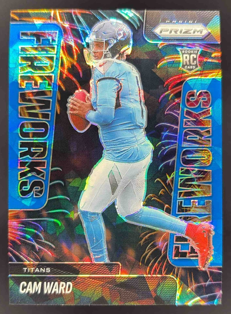 2025 Panini Prizm Fireworks Blue Ice Prizm #1 Cam Ward RC /99