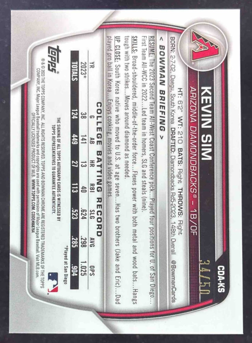 2023 Bowman Draft Chrome Gold Shimmer Refractor #CDA-KS Kevin Sim RC Auto /50