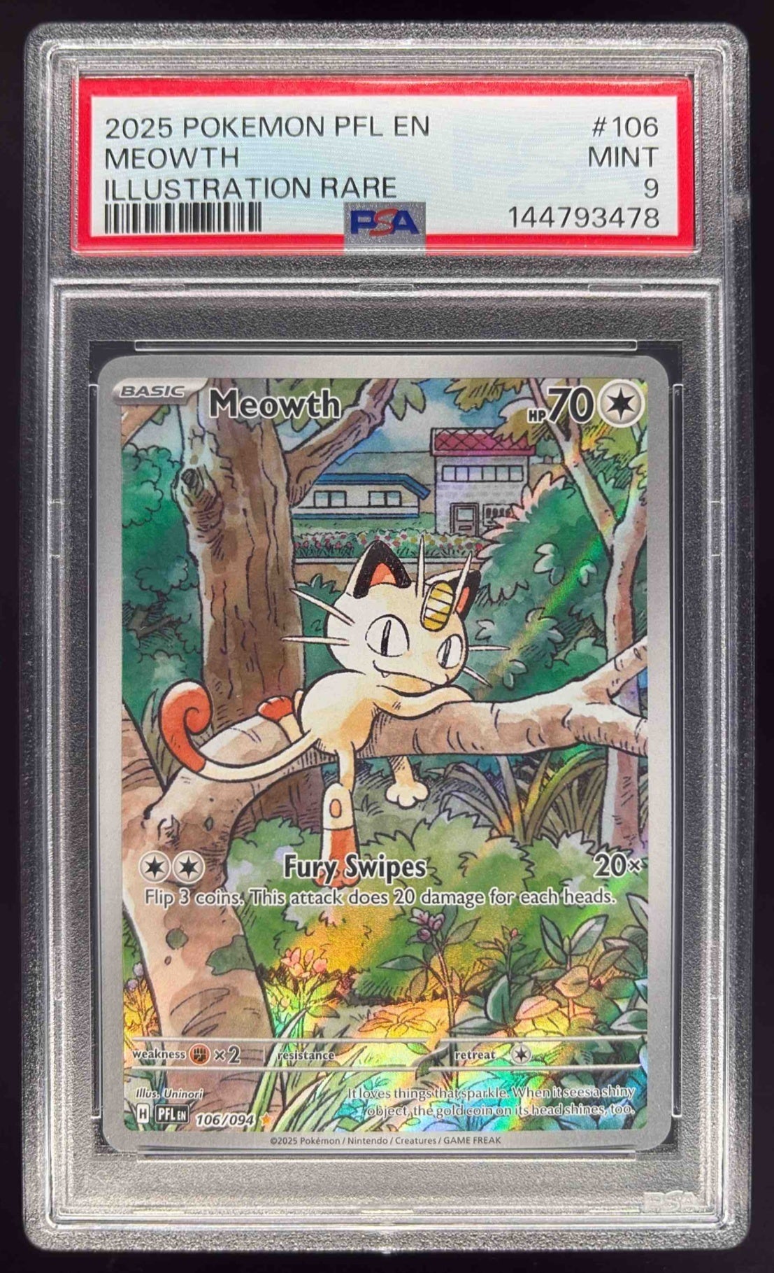 2025 Pokemon Phantasmal Flames #106/094 Meowth Illustration Rare PSA 9