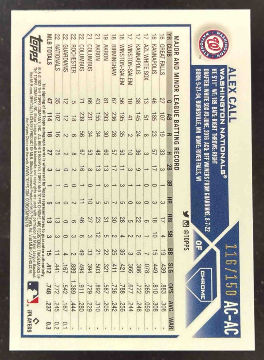 2023 Topps Chrome Blue RayWave Refractor #AC-AC Alex Call Autograph RC Auto /150