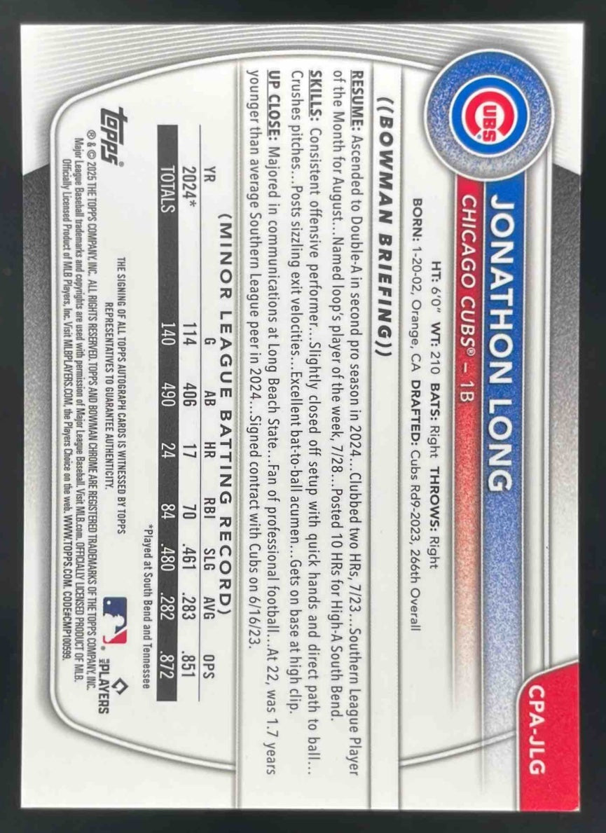 2025 Bowman Chrome Prospect Autographs #CPA-JLG Jonathon Long RC Auto