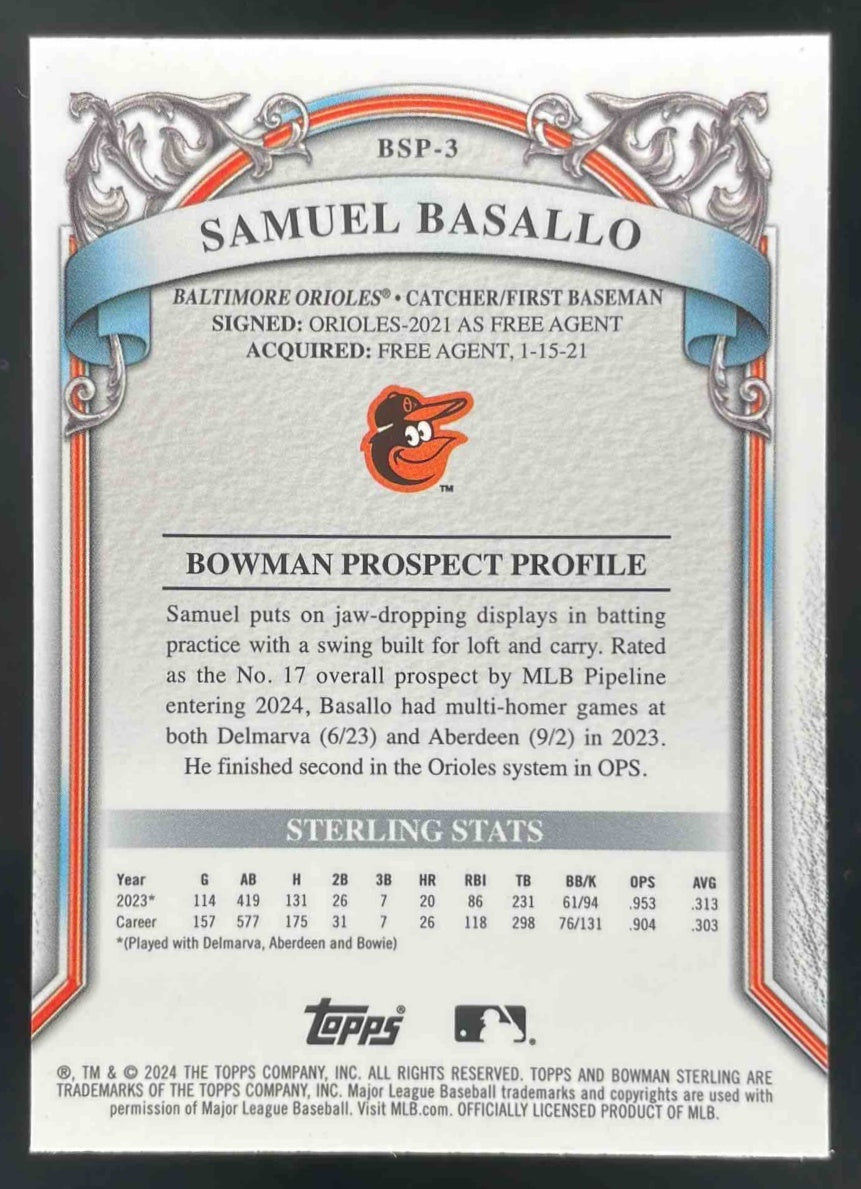 2024 Bowman Sterling Prospect Blue Refractor #BSP-3 Samuel Basallo /25