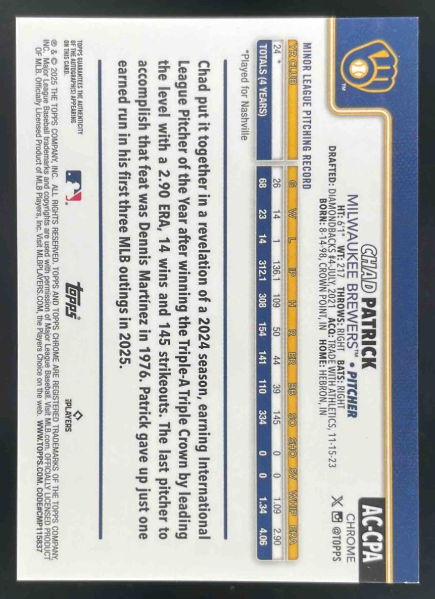 2025 Topps Chrome Rookie Autographs Green #AC-CPA Chad Patrick RC Auto /99
