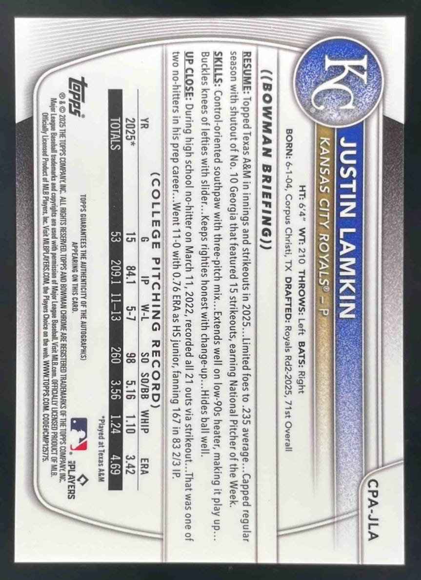 2025 Bowman Draft Chrome Sunflower Seeds Refractor Justin Lamkin RC Auto /5