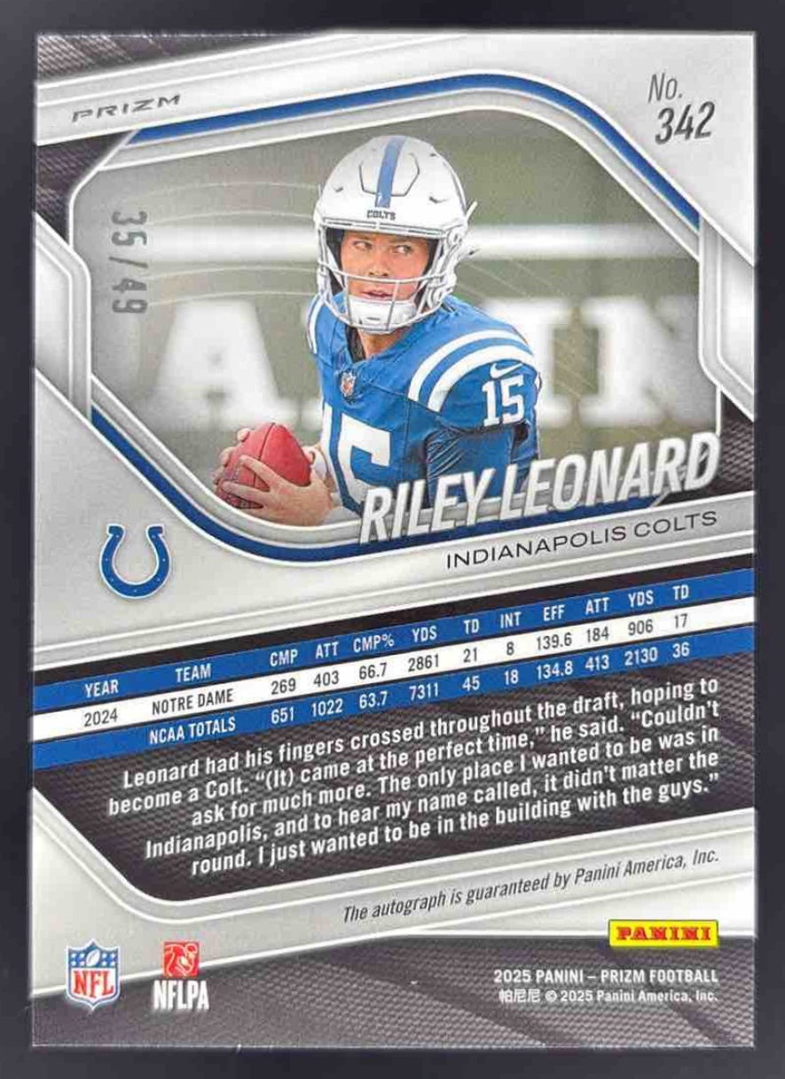 2025 Panini Prizm Rookie Purple Power Prizm #342 Riley Leonard RC Auto /49