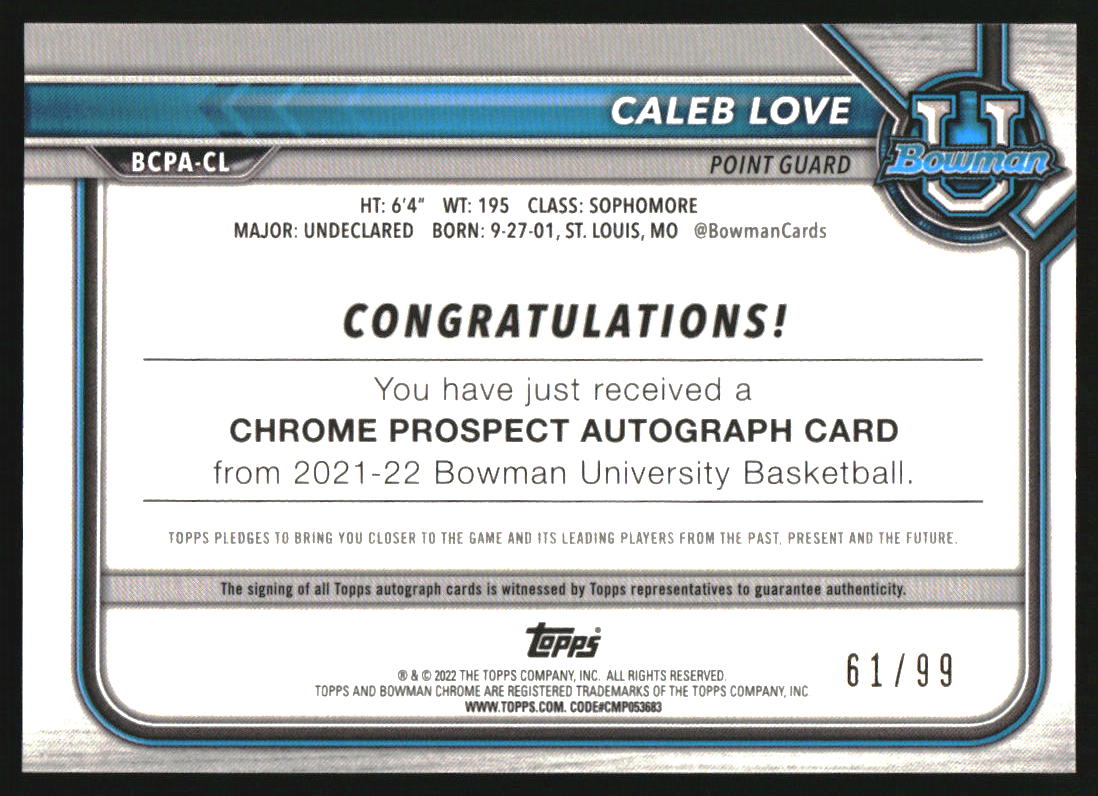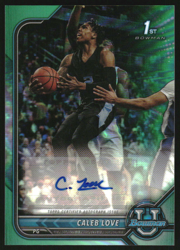 2021 Bowman Chrome University Chrome Prospect Green #CL Caleb Love RC Auto /99