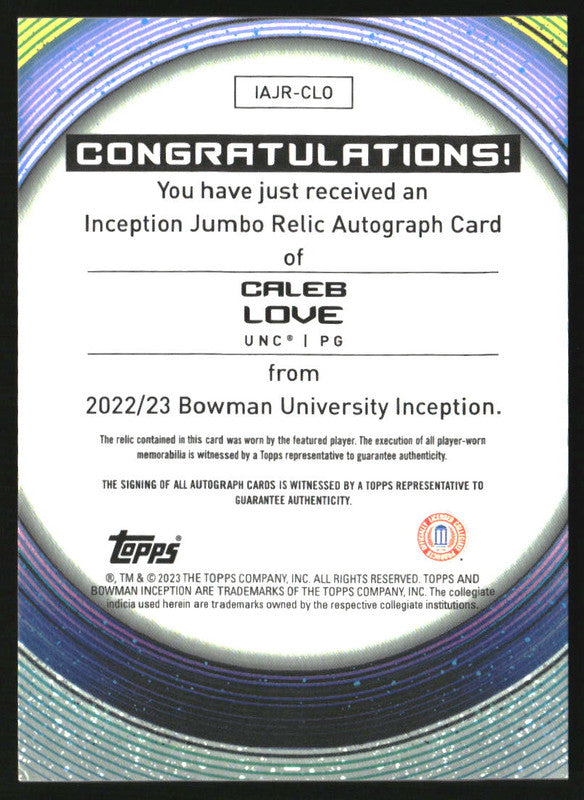 2022-23 Bowman Inception University Jumbo Relic Autographs Caleb Love Auto /199