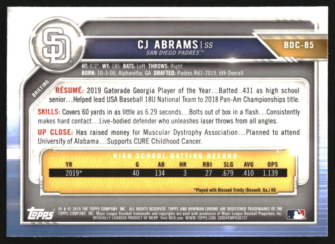 2019 Bowman Chrome Draft Sapphire #BDC-85 CJ Abrams RC