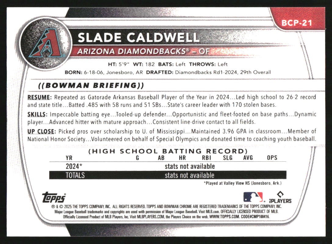 2025 Bowman Chrome Yellow X-Fractor #BCP-21 Slade Caldwell RC /75