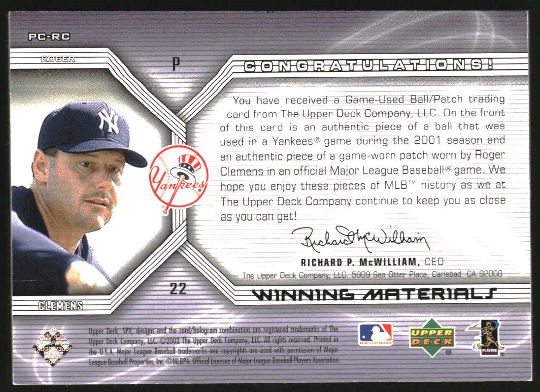 2002 SPx Winning Materials Ball Patch Combos #PCRC Roger Clemens /25