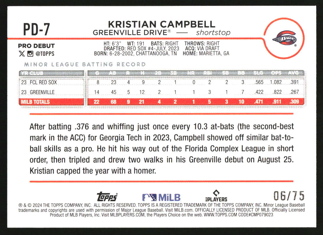 2024 Topps Pro Debut Aqua Foil #PD-7 Kristian Campbell /75