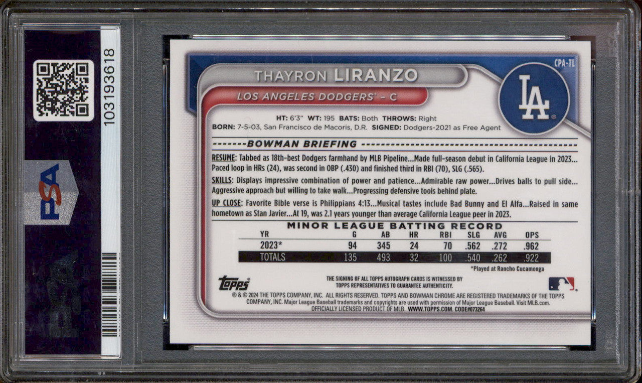 2024 Bowman Chrome Prospect Autographs #CPATL Thayron Liranzo RC Auto PSA 10