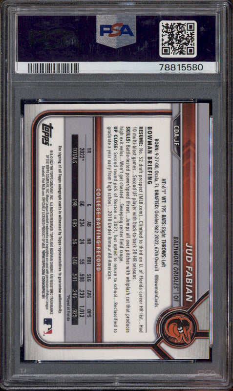 2022 Bowman Draft Chrome Autograph #CDAJF Jud Fabian RC Auto PSA 10