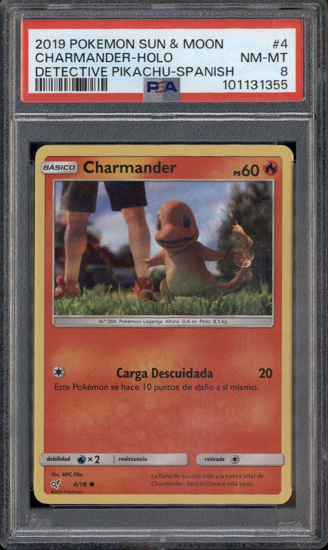 2019 Pokemon Sun & Moon Detective Pikachu Spanish #4/18 Charmander Holo PSA 8