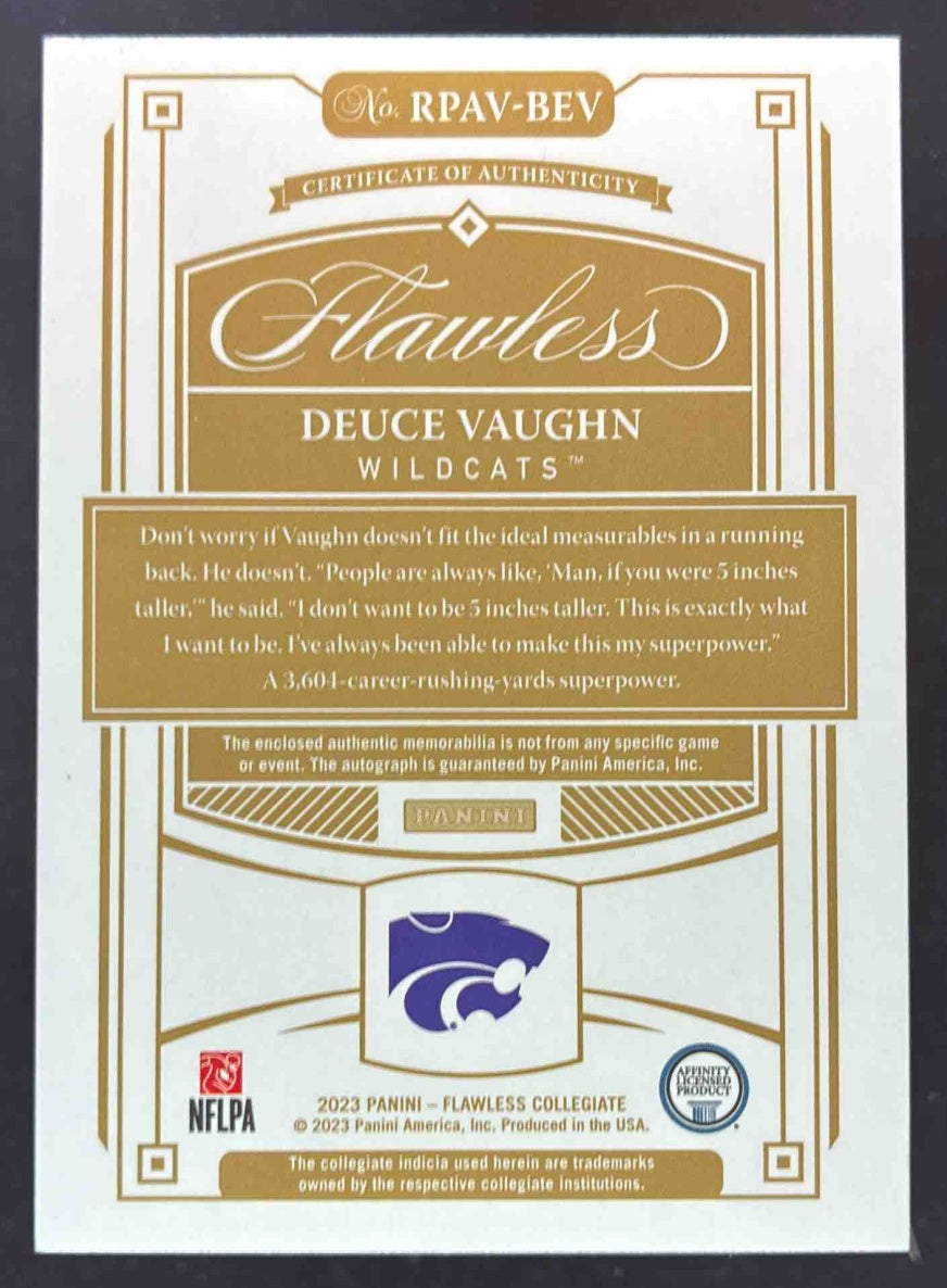 2023 Flawless Collegiate Rookie Patch Vertical #RPAVBEV Deuce Vaughn RC Auto /25
