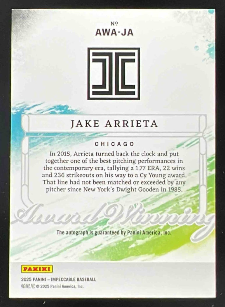 2025 Panini Impeccable Award Winning Autographs #AWA-JA Jake Arrieta Auto /99