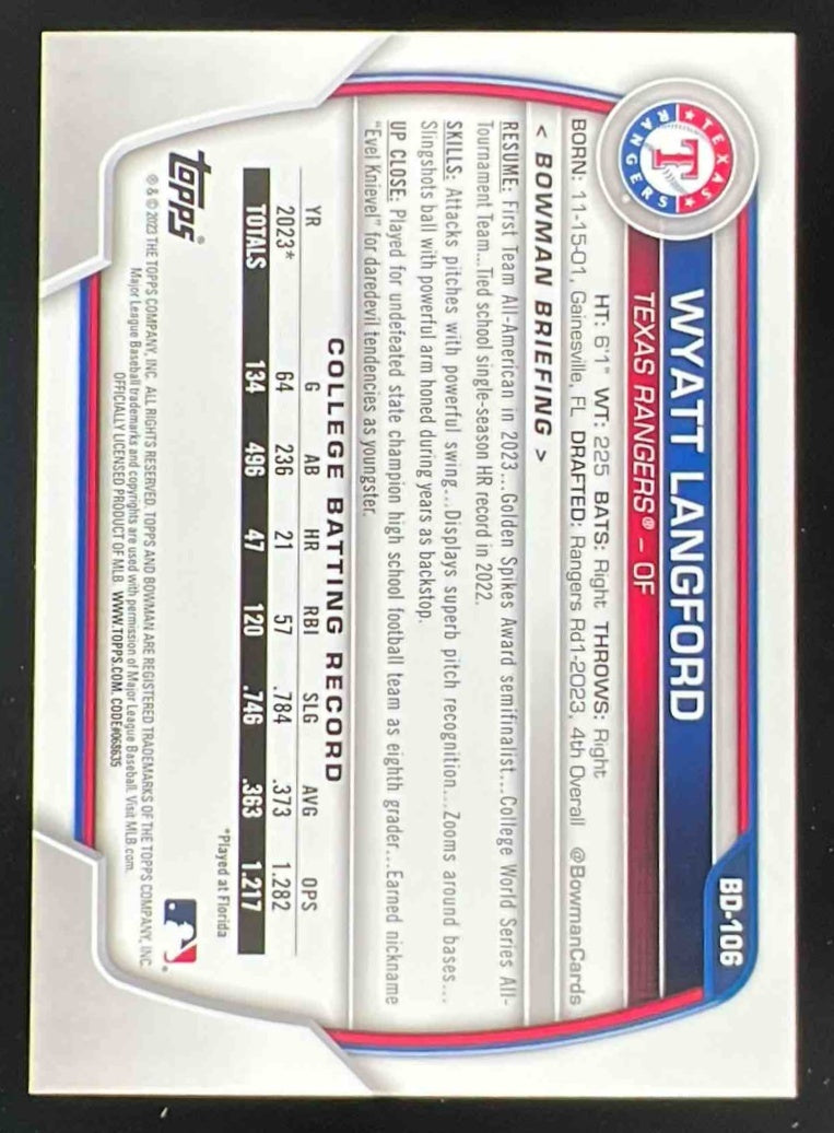 2023 Bowman Draft Aqua/Pink Gradient #BD-106 Wyatt Langford RC /199