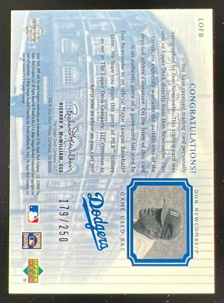 2000 UD Brooklyn Dodgers Master Legends of Flatbush Don Newcombe Auto /250
