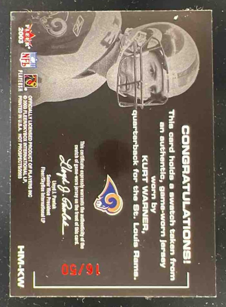 2003 Fleer Hot Prospects Hot Materials Red #HM-KW Kurt Warner /50