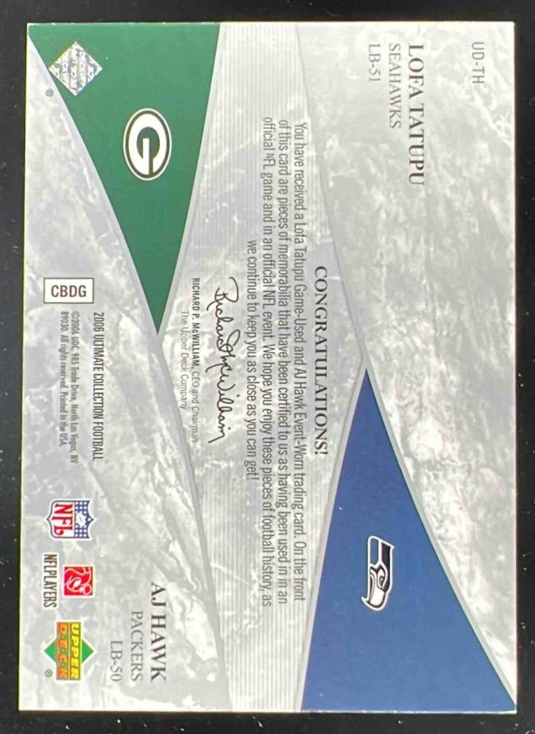 2006 Ultimate Collection Jerseys Dual Patch #UD-TH Lofa Tatupu A.J. Hawk /50