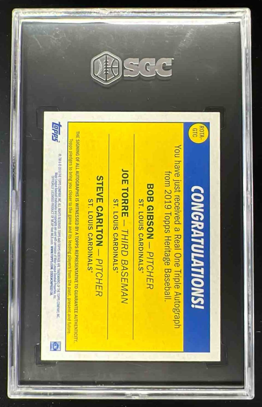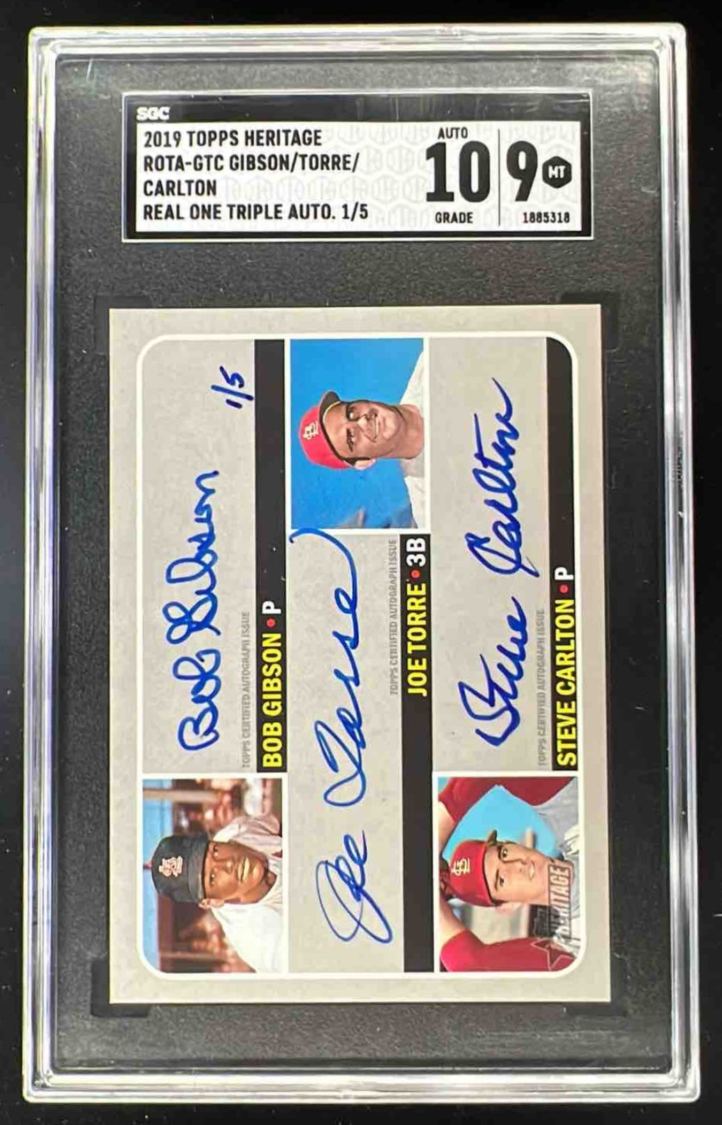 2019 Topps Heritage Real Triple Auto Steve Carlton Bob Gibson Joe Torre /5 SGC 9