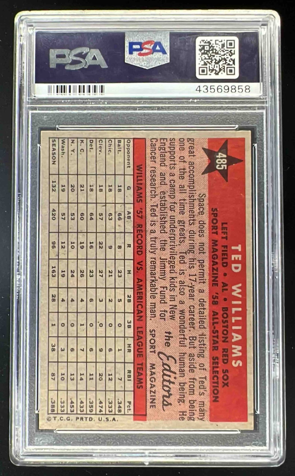 1958 Topps #485 Ted Williams PSA 9 (PD)