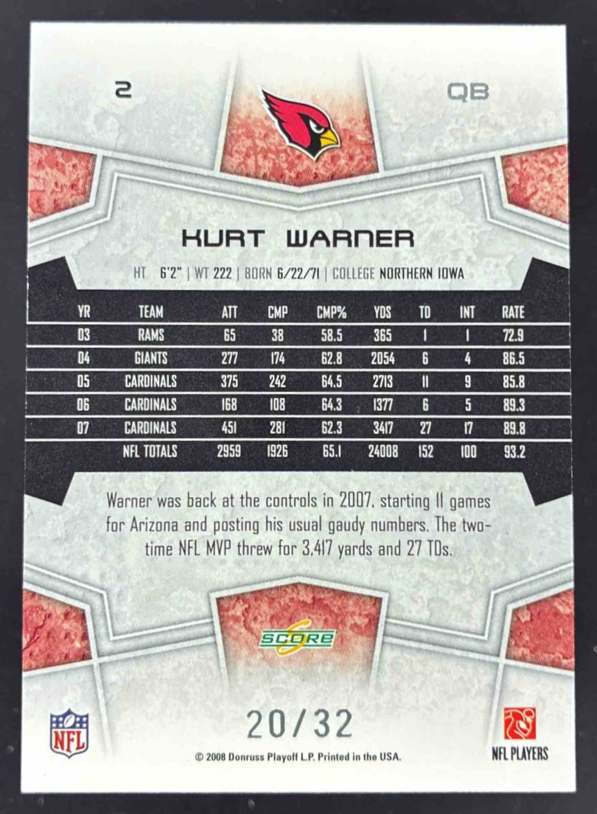 2008 Score Artist's Proof #2 Kurt Warner /32
