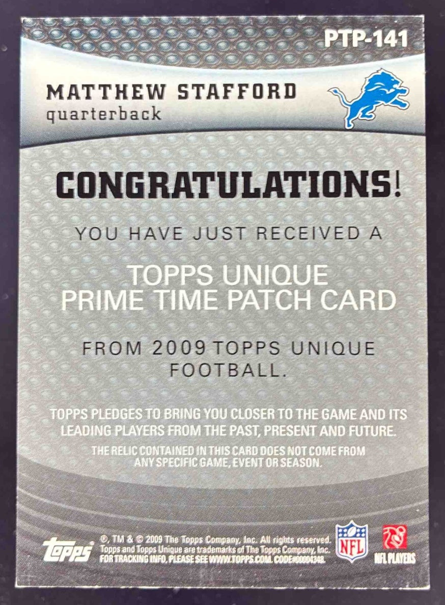2009 Topps Unique Prime Time Patches #PTP-141 Matthew Stafford RC /50