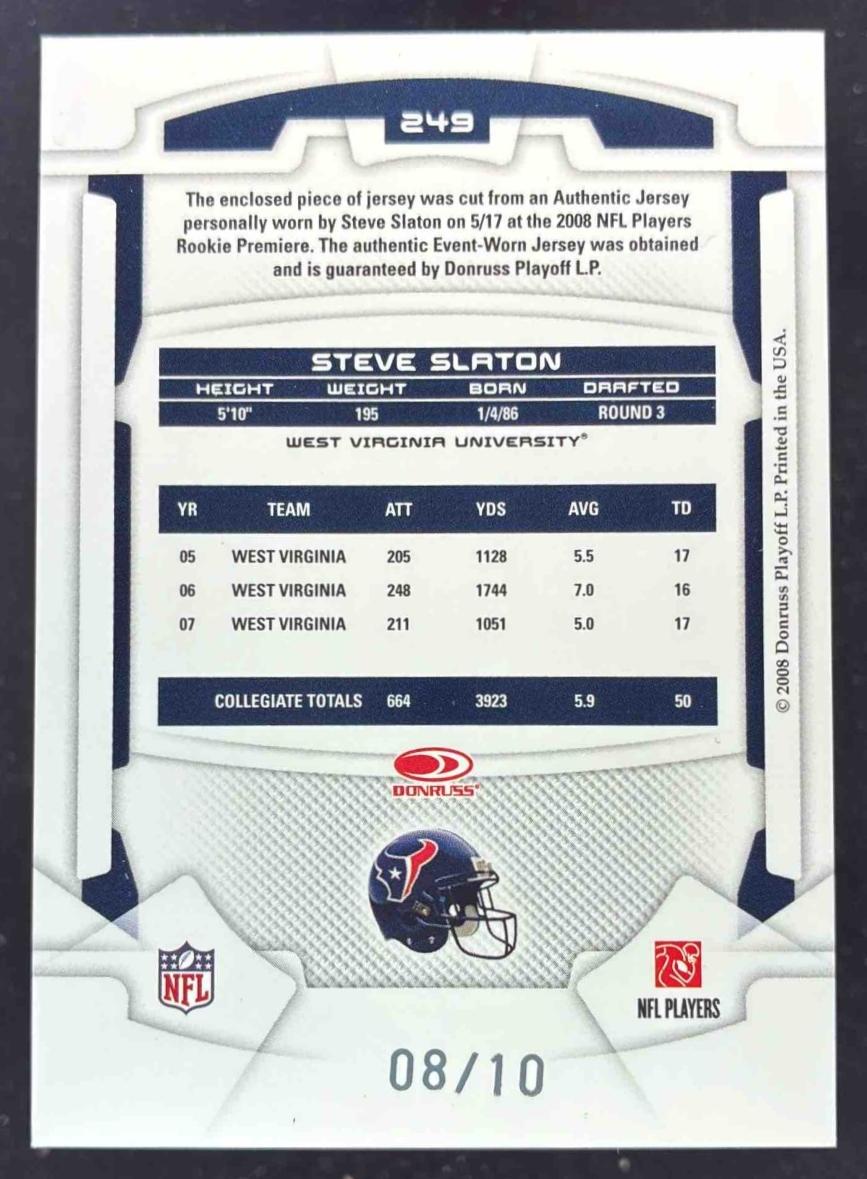 2008 Rookies & Stars Rookie Jersey Jumbo Swatch Emerald #249 Steve Slaton RC /10