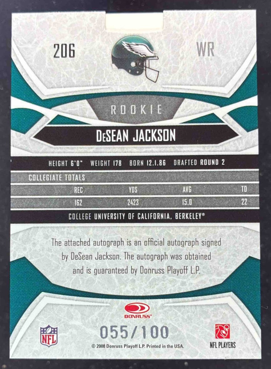 2008 Donruss Gridiron Gear #206 DeSean Jackson RC Auto /100