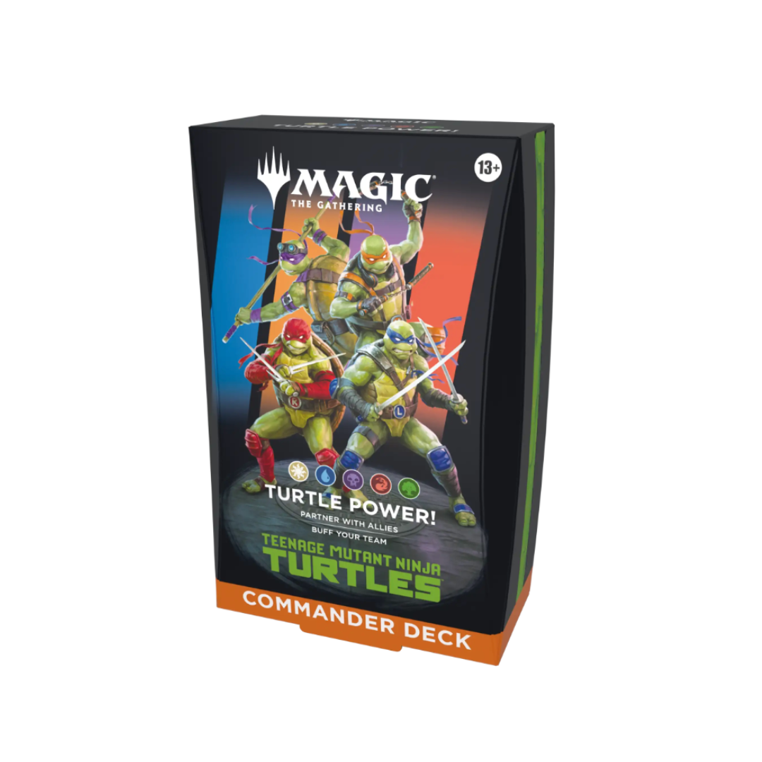 Magic players of all skill levels team up with the TMNT to fight bad guys in this exciting new co-operative strategy format for up to four players! Equip awesome ninja gear, play with your favorite of the four pre-built 60-card hero decks, then crack open the four included Play Boosters for even more ways to get the drop on the pre-built enemies deck featuring Shredder and his cronies!